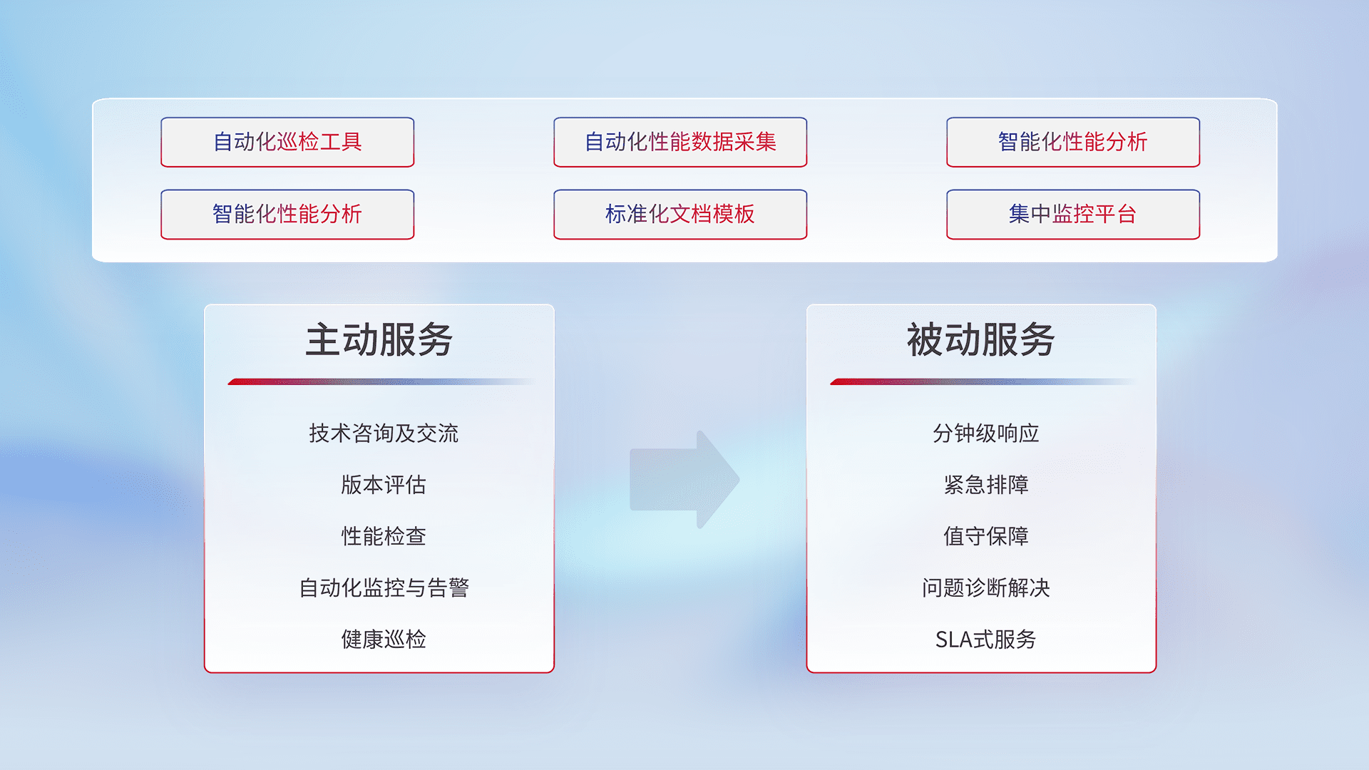 智能化工具和标准化文档,,保障服务质量,,提供主动服务(包含技术咨询、、版本评估、、、、性能检查、、、自动化监控与告警、、健康巡检)和被动服务包含(分钟级响应、、紧急排障、、值守保障、、、、问题诊断解决、、、SLA服务)。。。